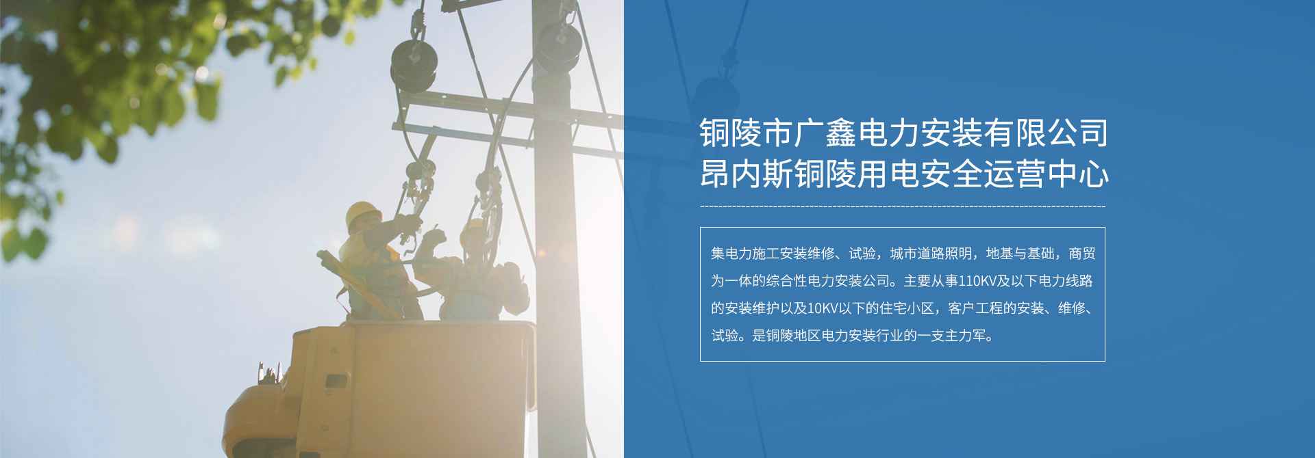 公司下设6个职能科室,1个运营中心。是集电力施工安装维修、试验,城市道路照明,地基与基础,商贸为-一体的综合性电力安装公司。主要从事110KV及以下电力线路的安装维护以及10KV以下的住宅小区,客户工程的安装、维修、试验。是铜陵地区电力安装行业的一支主力军。